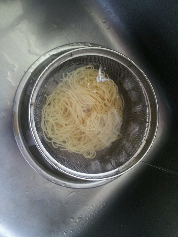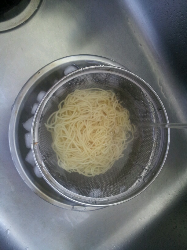 茹で時間通常2~3分だけど水で締めるため3分半茹でる。