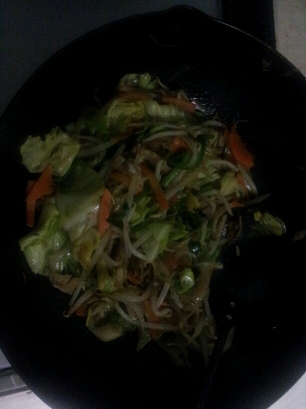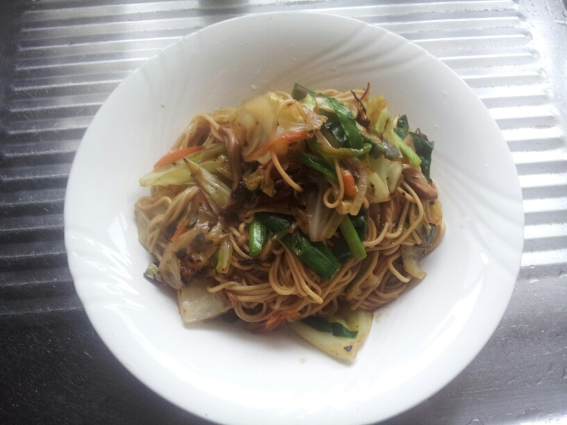 野菜炒めに茹であげた麺を入れ、付属の油を麺に絡め、茹で汁をカップ半分ほど入れ残りの粉末スープを入れる。